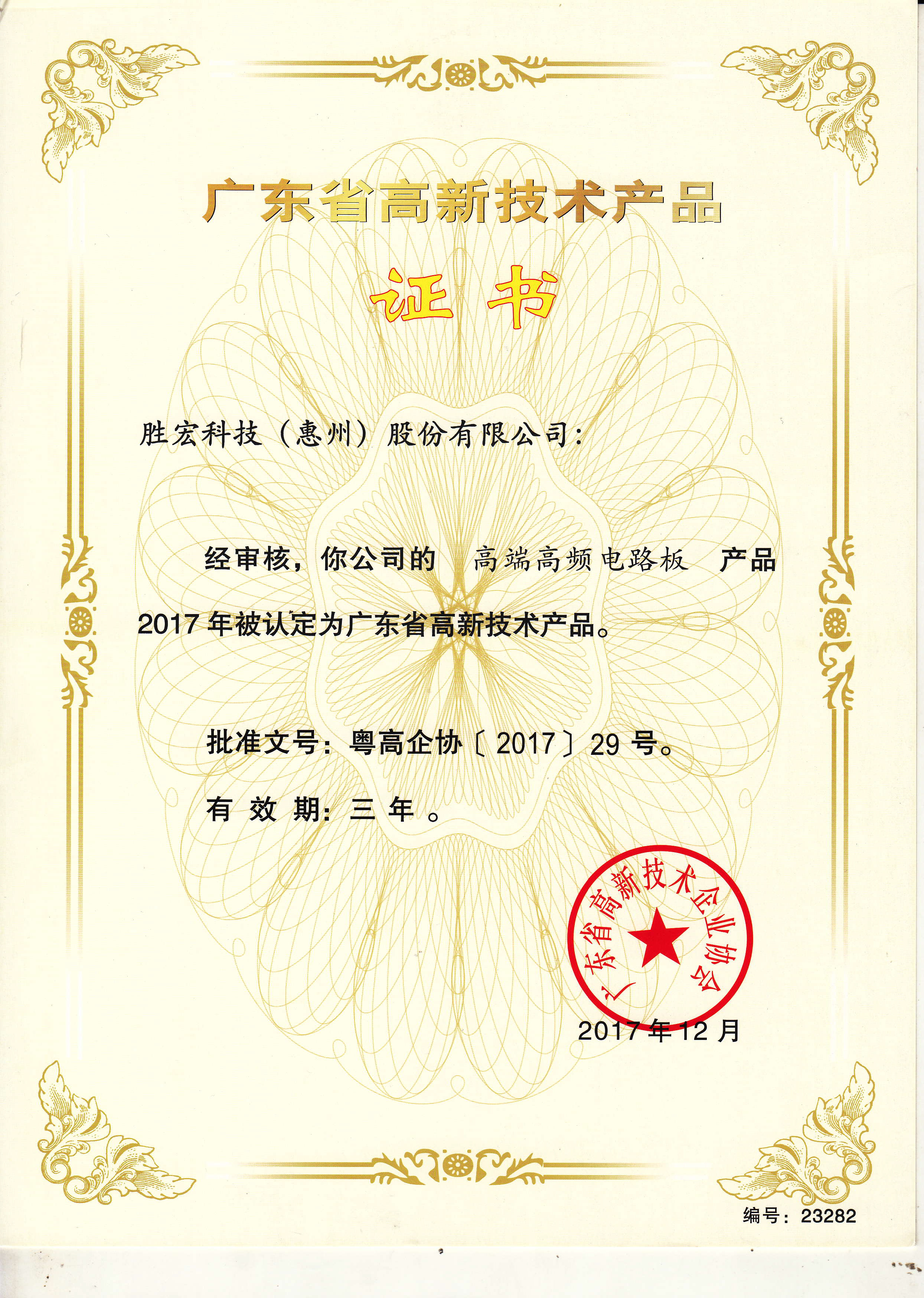 “高端高频电路板”高新技术产品证书